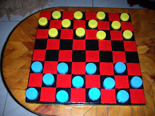 To make a long story short every thing came together just fine and we have been enjoying the heck out of this checkerboard. After Chiqui got the hang of it he started learning strategy very quickly and it wasn't long before he was beating his mother and his grandmothers and all of his cousins and to date I am the only one he hasn't beat. It is getting too close for comfort. In fact, the games get so tense that when we have to go to the bathroom we have to have another party guard the board to prevent.... ahem...someone from "accidentally" moving a piece in their favor. If it wasn't for this we would probably both rather pee in our pants than leave the board unguarded.